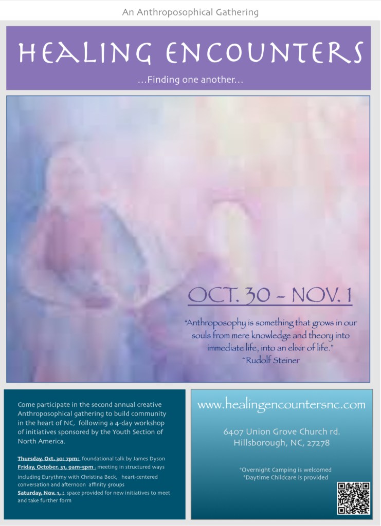 | Greetings from the Eastern Region Holding Group!“We should see significance in the fact that we receive the spiritual treasures of Anthroposophy together with those who are united with us as members of the Society. This feeling of being together and of receiving the Spiritual together, is not to be viewed lightly as having no meaning or value.” –Rudolf Steiner, The Life, Nature and Cultivation of Anthroposophy CW26 6 April 1924 | |